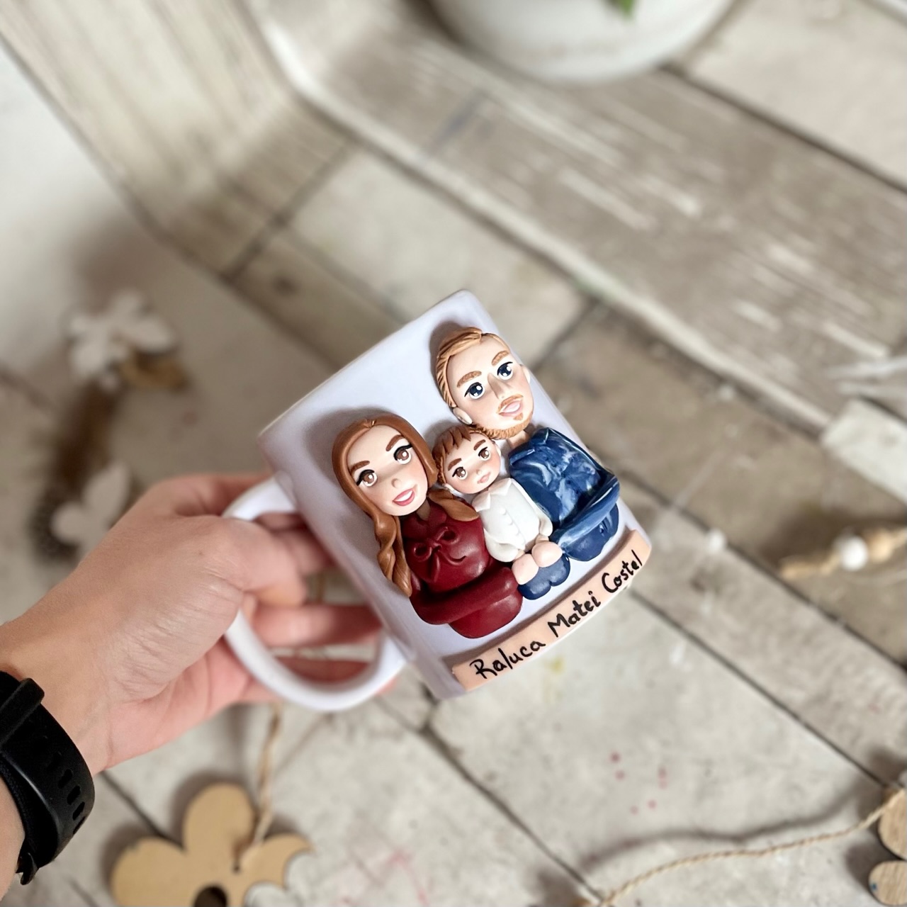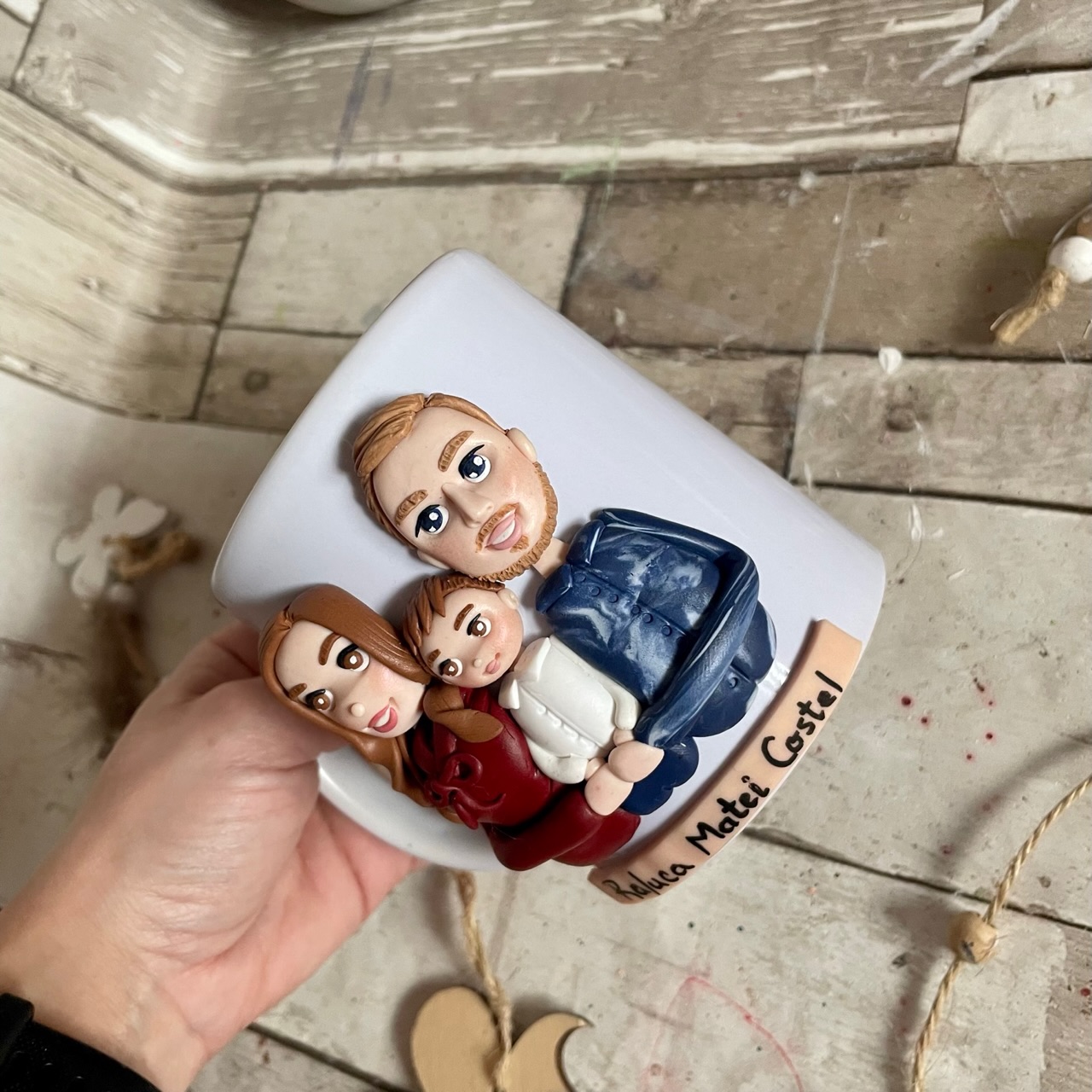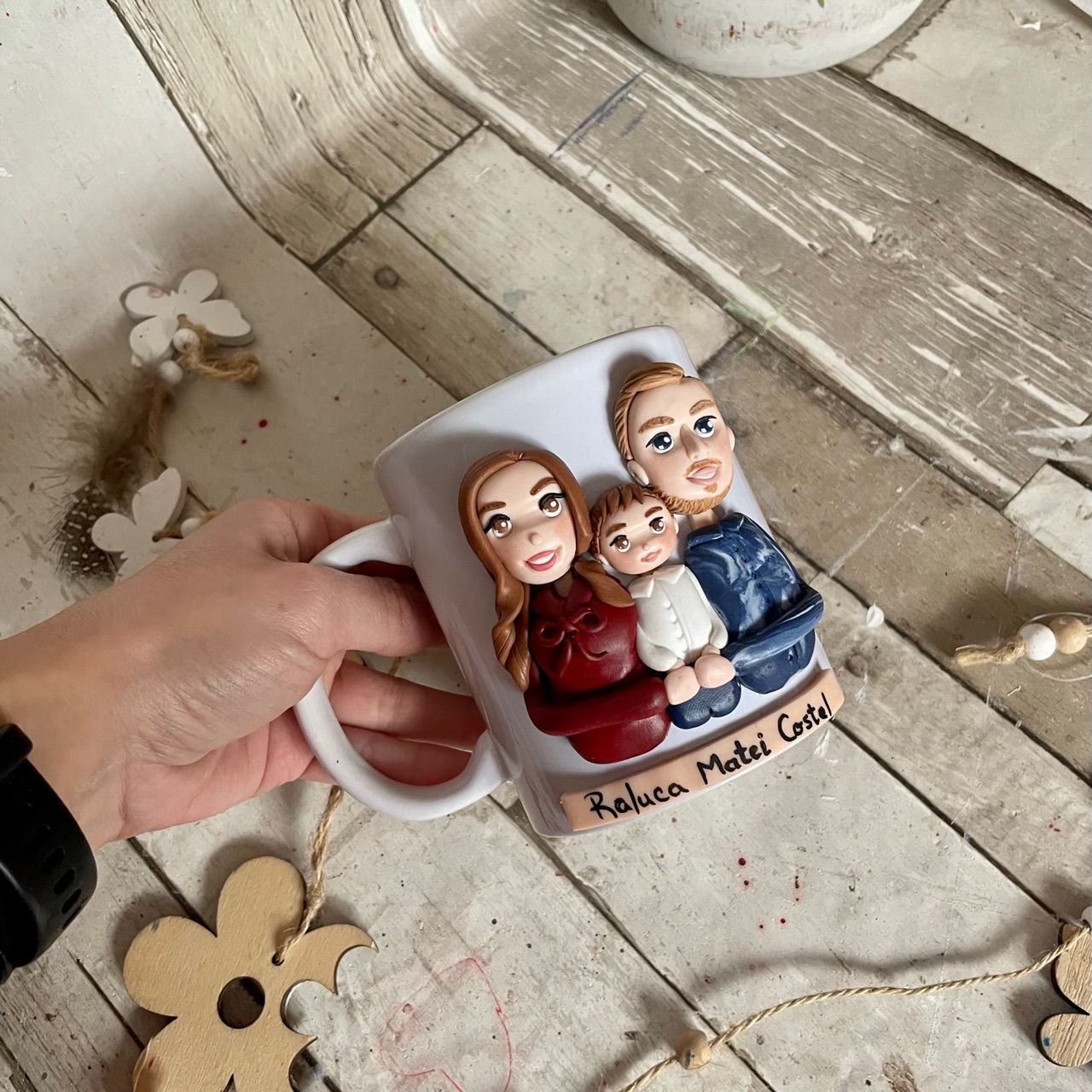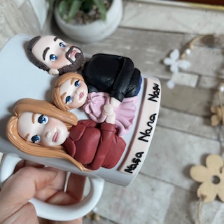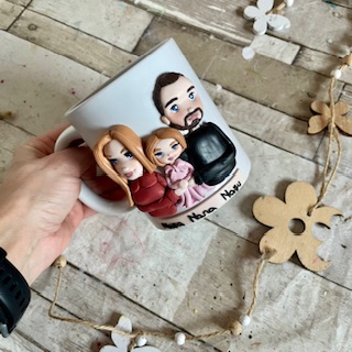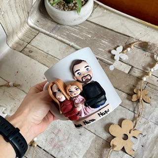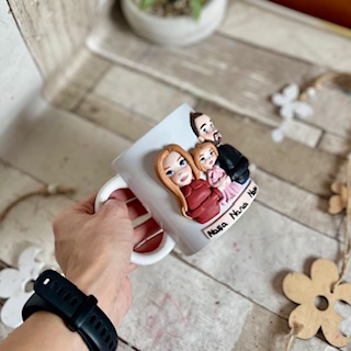 Cana decorata manual cu pasta polimerica fimo. Pretul este orientativ, pentru o cana cu 2 personaje si un copil.
