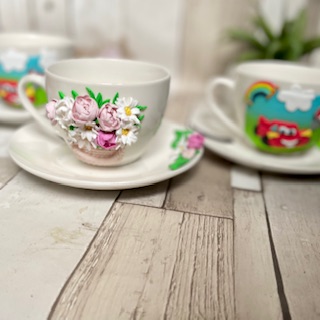 Cana decorata manual din pasta polimerica fimo. Pretul afisat este pentru o cana si o farfurie.