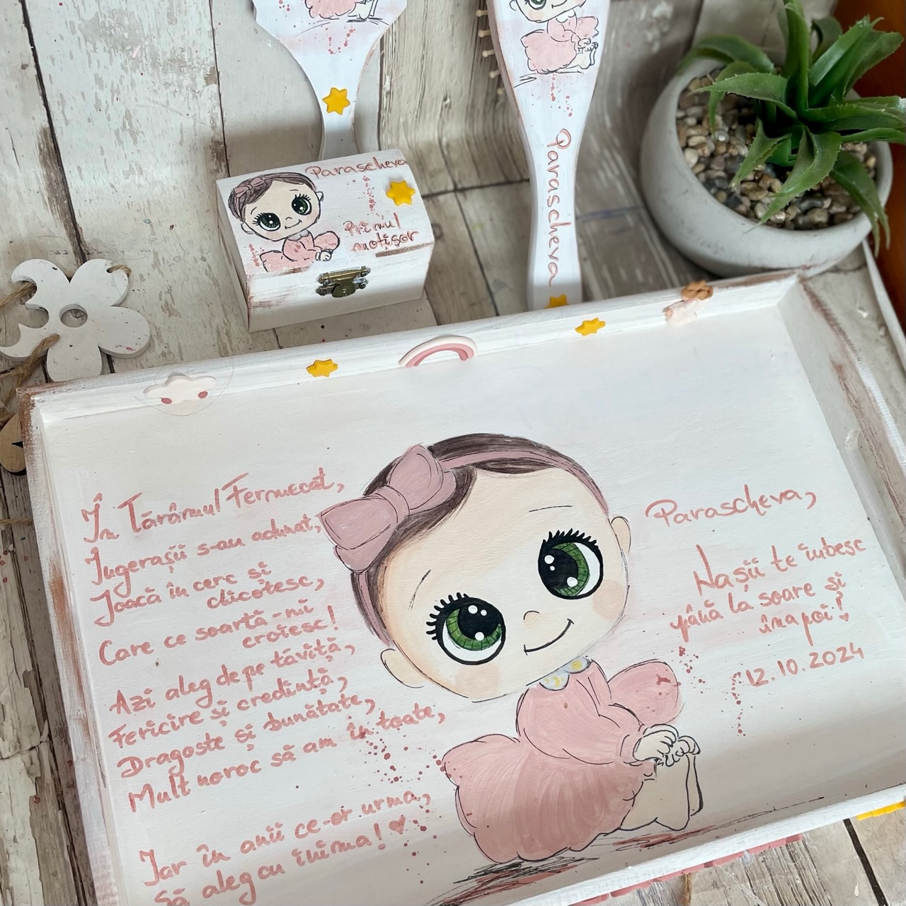 Atat tava cat si cufarul din lemn sunt pictate manual in culori acrilice.