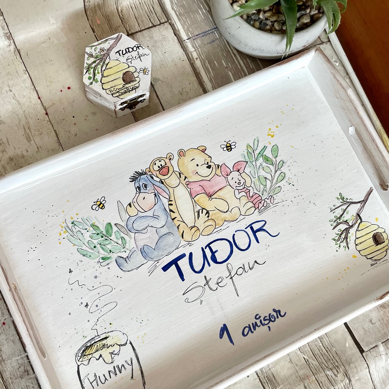 Atat tava cat si cufarul din lemn sunt pictate manual in culori acrilice.